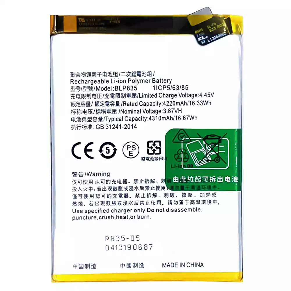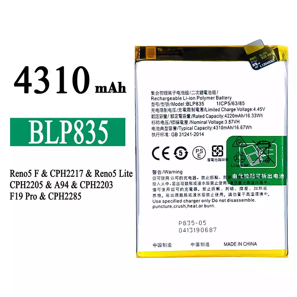 Bateria BLP835 para OPPO Reno5 F /Reno5 Lite /F19 Pro /A94 4G /CPH2217 /CPH2205 /CPH2203 /CPH2285